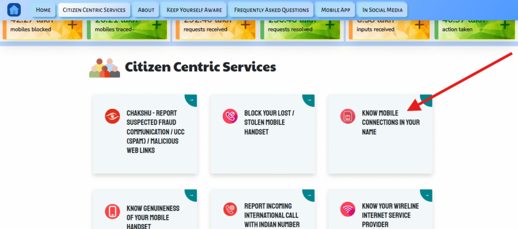 Click on “Know Your Mobile Connections“ or TAFCOP services section.