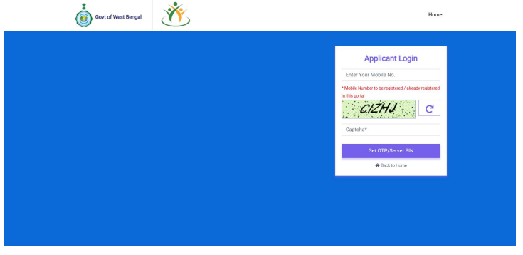 Step 3: The applicant must enter a valid and active mobile number along with the captcha. Upon submission, a secret PIN (OTP) will be sent via SMS to the registered mobile number, which must be used to complete the login process.
